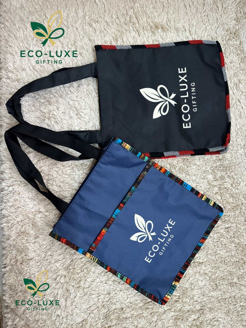 Elevate your gifting or everyday carry with the Eco-Luxe Signature Tote. This durable, stylish bag is made from sturdy fabric in classic Black or Navy Blue and features the prominent Eco-Luxe Gifting logo. The key design detail is the vibrant, patterned trim (like an African print) along the borders, adding a distinctive pop of color. Perfect as a reusable gift bag or a chic daily tote.